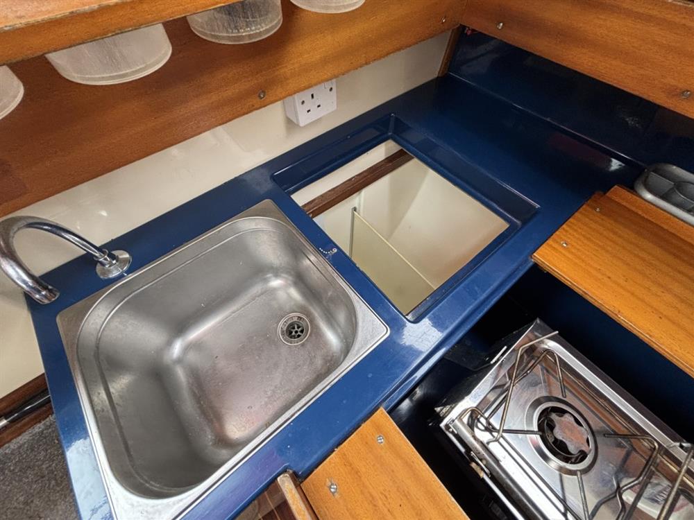 Galley unit with sink, hob, fridge, and crockery/cutlery