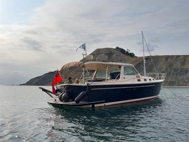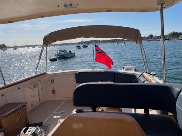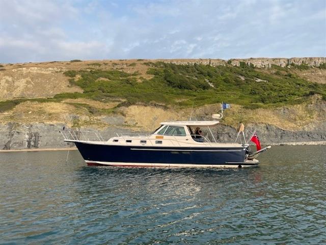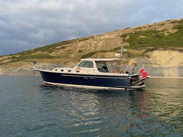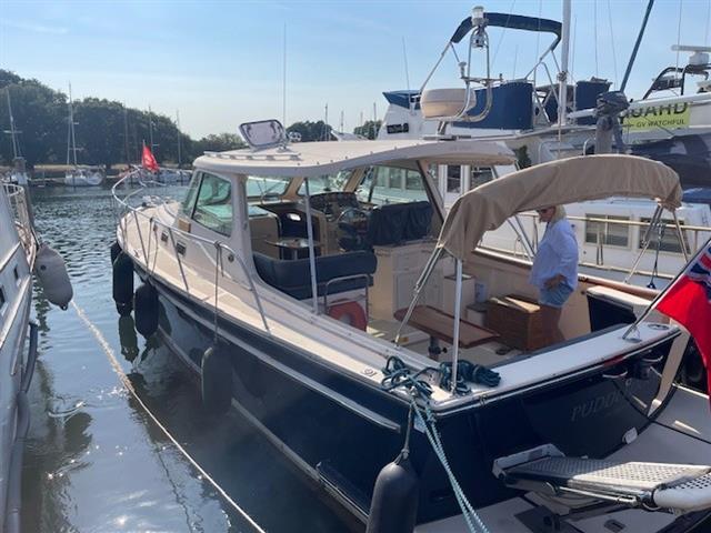 2004 Island Packet Craft Express 360 Cruiser with twin Yanmar 370hp diesel engines on shaft drive. ‘Puddleduck’ is a unique craft, being one of a smaller number of motorboats produced by the renowned sailboat and motorsailer builder Island Packet. A picnic boat style launch, with the look of a Duchy or a Hinckley and the feel of a Nimbus, Puddleduck is thought to be the only one of these models in Europe. Ideal for family days out on the water or extended cruising away for a couple. With the large open plan cockpit featuring two L shaped seating areas with tables and wet bar, you can already imagine your family all enjoying the time on the water together. When it’s time to retreat below decks, there is ample space for cooking, dining and sleeping, with a spacious heads compartment with Jack and Jill access from the cabin and saloon areas. Viewings welcome by appointment at Birdham Pool Marina, Chichester.