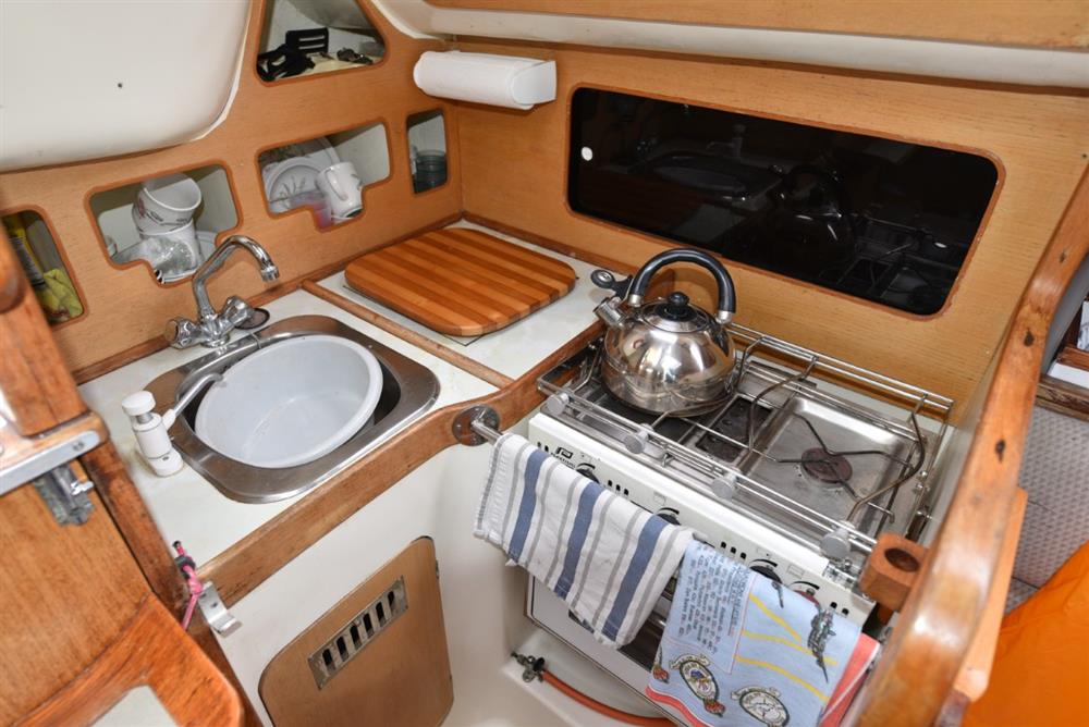 Galley with fridge, oven/grill/2 burner hob, and crockery/cutlery