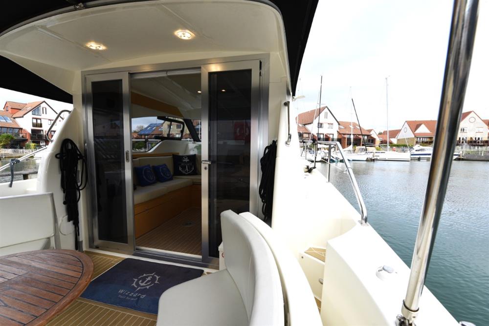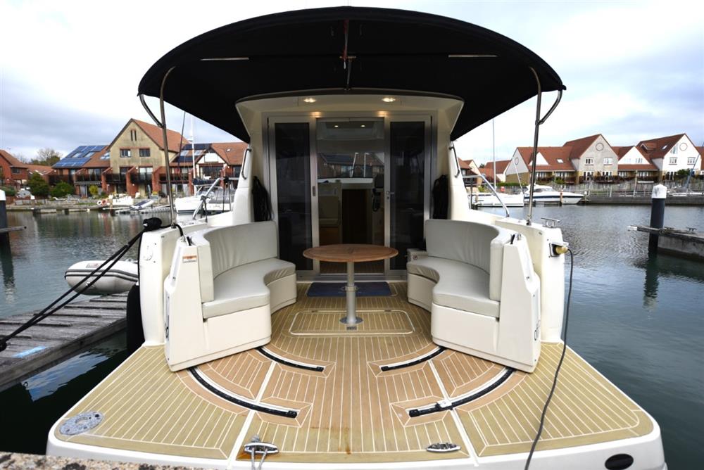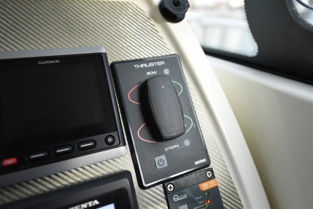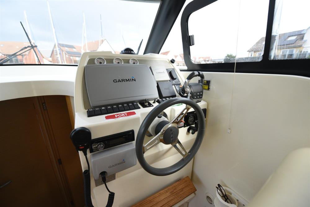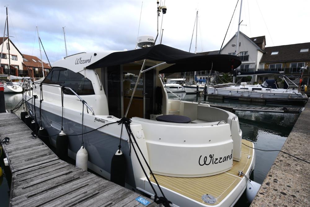 2014 Rodman Spirit 31 Inboard with twin Volvo D3 170, upgraded to 220hp engines. ‘Wizzard’ is a wonderful example of the inboard version of Rodman’s versatile Rodman Spirit 31. With its unique sliding transom seats, the Spirit 31 Inboard provides a completely walk-through open transom when the seats are in the open position, but they will slide to completely closed or anywhere in between. A rare find on the used market, Wizzard has twin engines that have been upgraded to produce 220hp, giving a 30 knot top end speed, and cruising around 22 knots. A dolphin grey hull wrap compliments the boats modern looks, and you won’t mind attracting attention in the marina as the boat is a doddle to berth thanks to her bow and stern thrusters. Certainly not a boat to miss, Wizzard is available to view in Port Solent Marina, with the Rodman UK specialists.