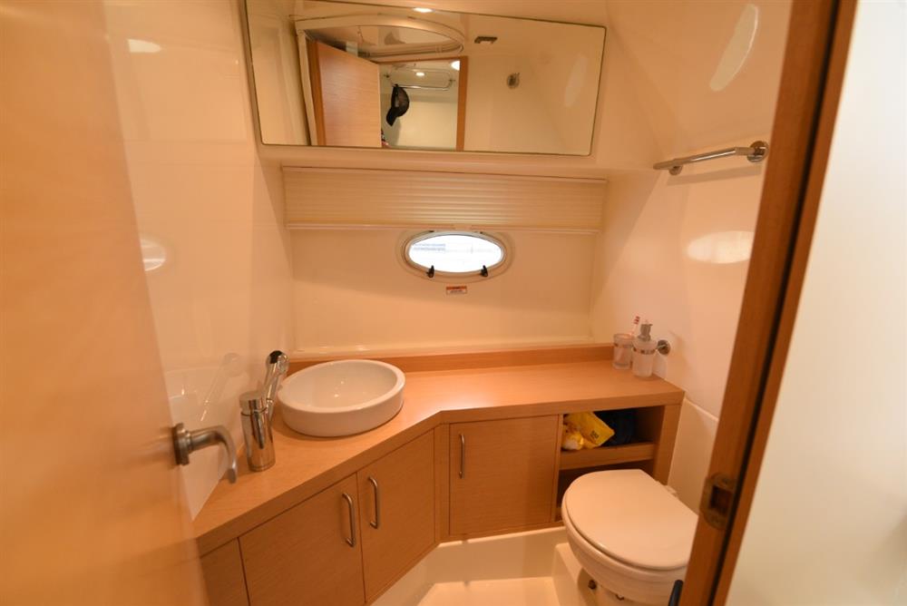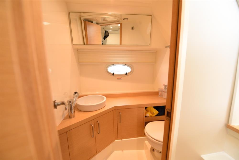 Separate heads compartment with shower (curtain), marine WC with Sea Smart toilet sanitiser (2022) and wash basin with hot & cold water