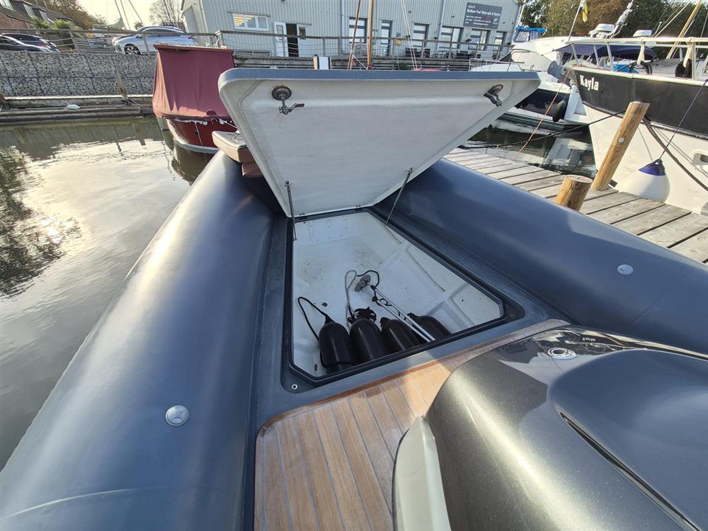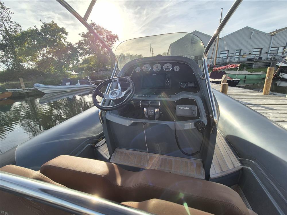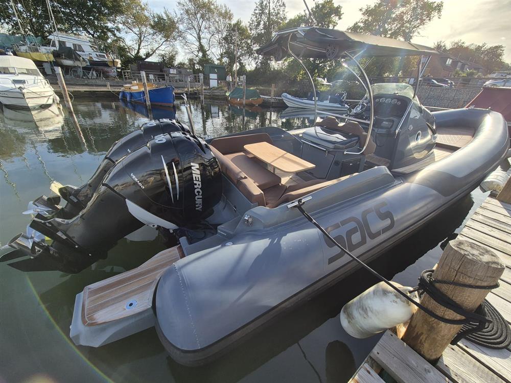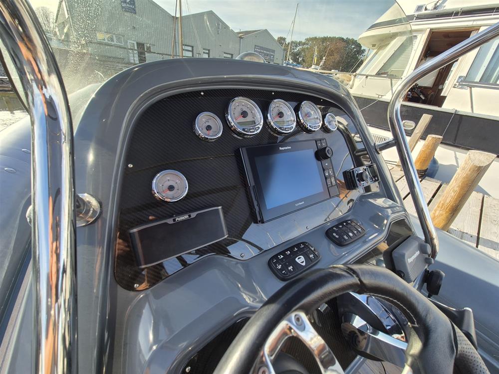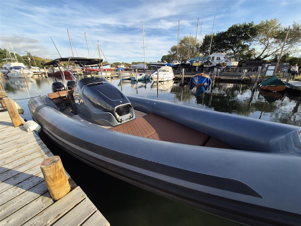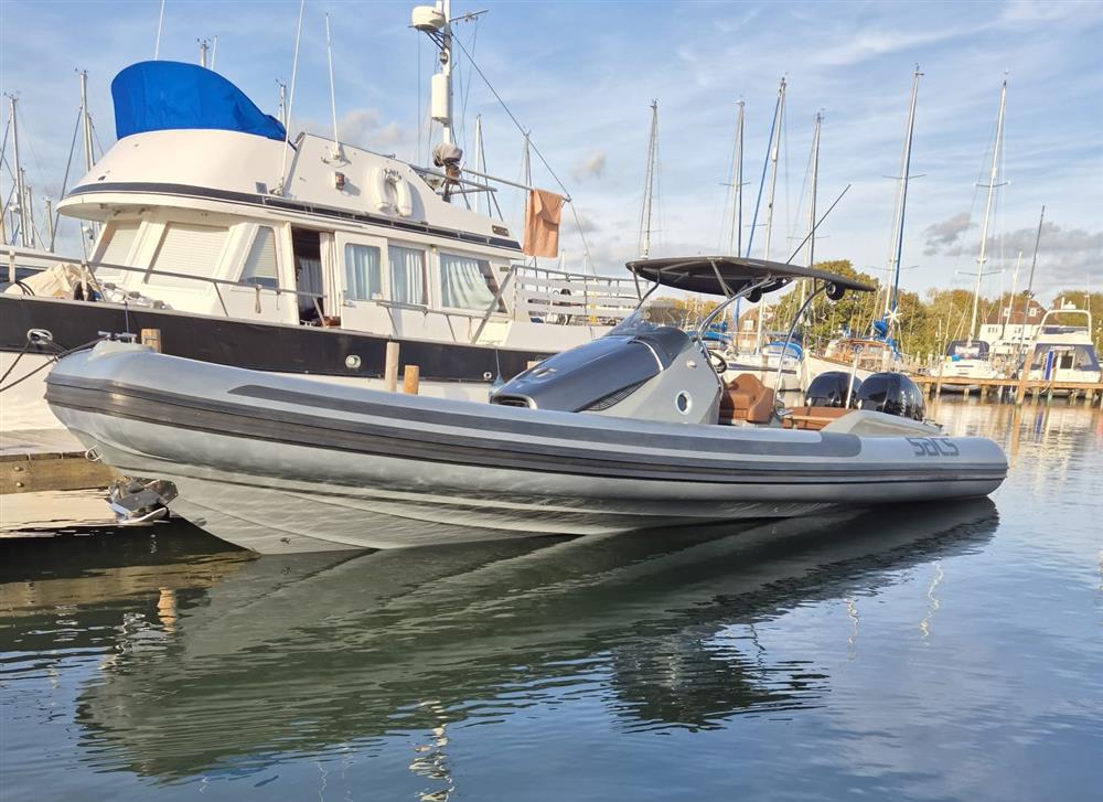 2016 SACS Strider 10 RIB, with 2x 300hp Mercury Verado Outboards. ‘Lock Stock’ is a super RIB; category B for up to 16 passengers, the boat features a sleeping compartment with toilet and holding tank, ideal for longer days out enjoying time with family and friends on the water, or the occasional overnight stay. High spec including Fusion stereo, Raymarine E97 plotter, underwater lights, and iPhone docking station with Bluetooth. Available to view by appointment at Birdham Pool Marina near Chichester.