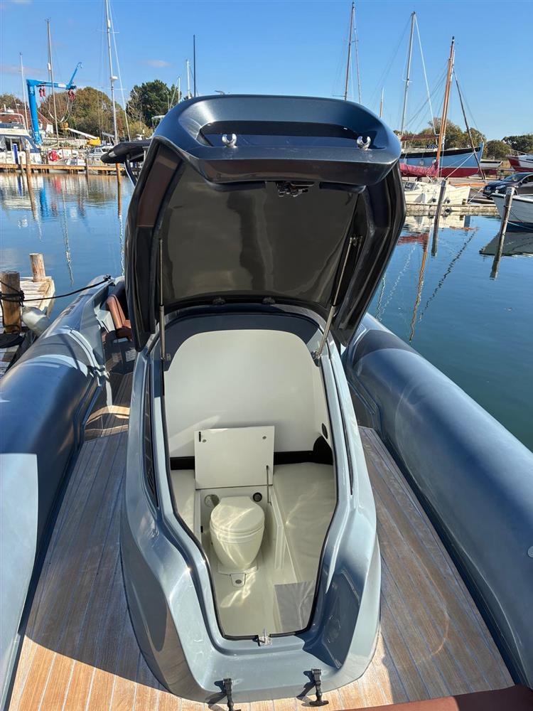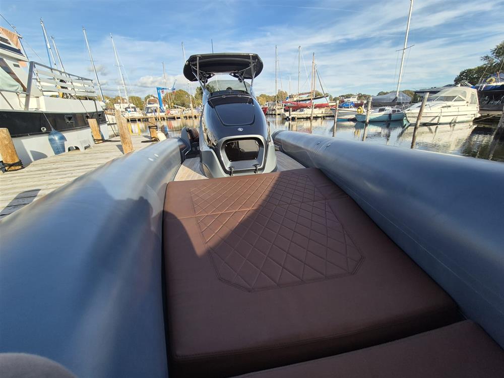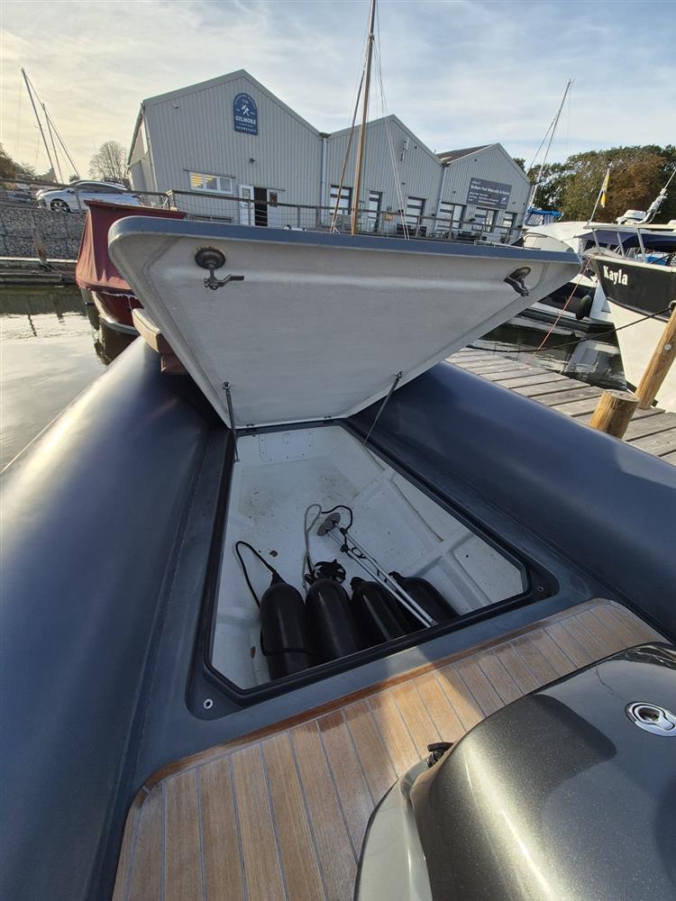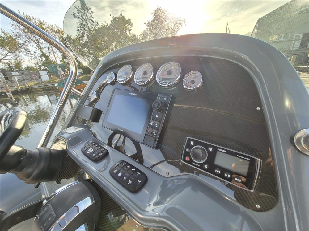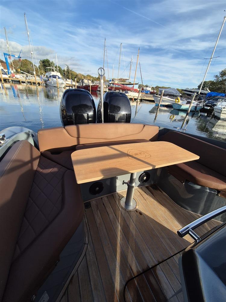 2016 SACS Strider 10 RIB, with 2x 300hp Mercury Verado Outboards. ‘Lock Stock’ is a super RIB; category B for up to 16 passengers, the boat features a sleeping compartment with toilet and holding tank, ideal for longer days out enjoying time with family and friends on the water, or the occasional overnight stay. High spec including Fusion stereo, Raymarine E97 plotter, underwater lights, and iPhone docking station with Bluetooth. Available to view by appointment at Birdham Pool Marina near Chichester.
