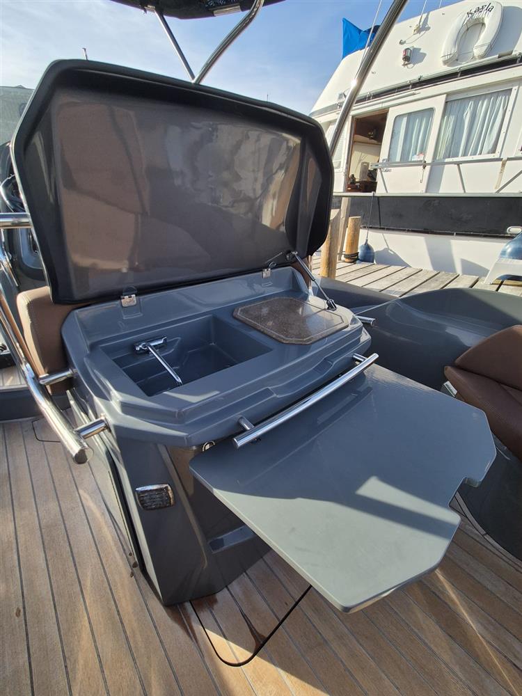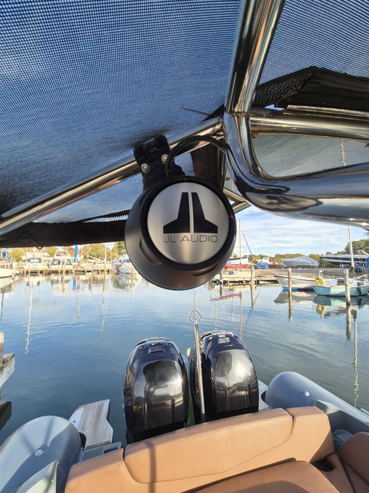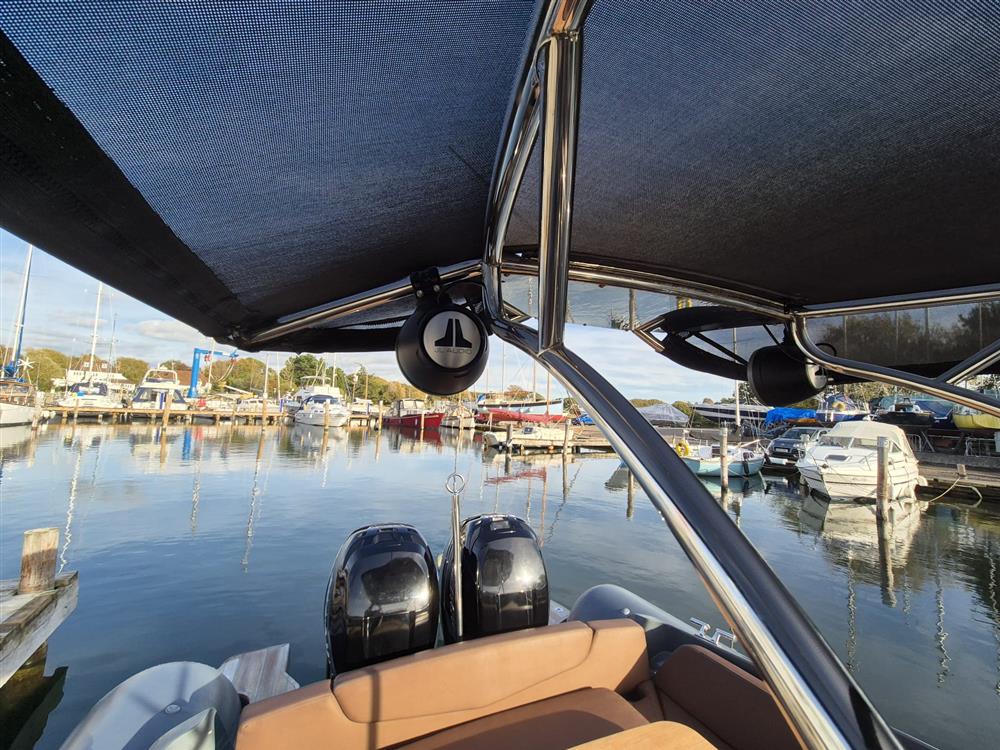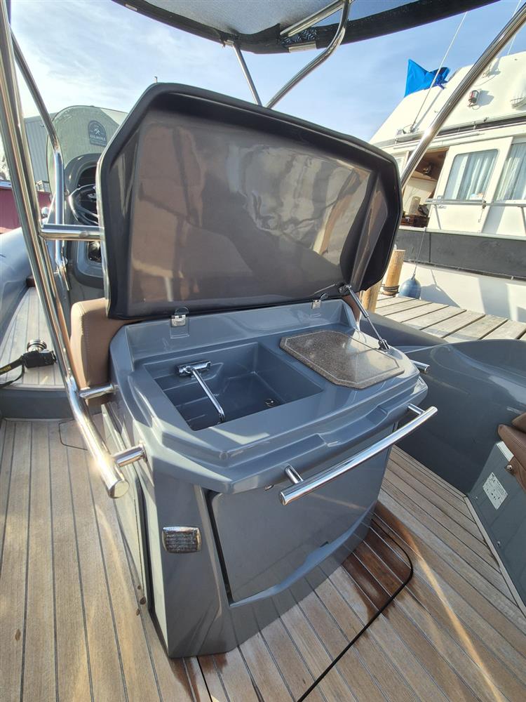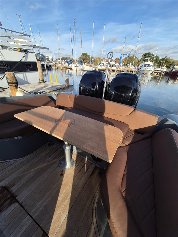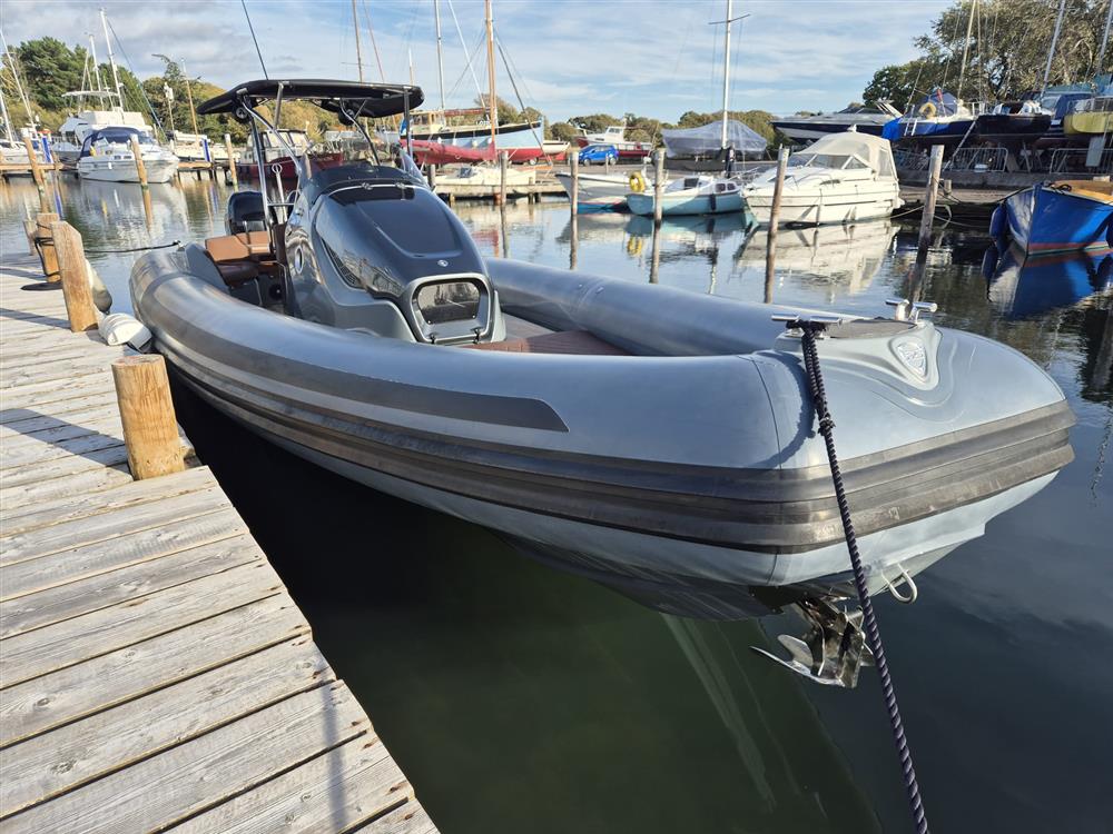 2016 SACS Strider 10 RIB, with 2x 300hp Mercury Verado Outboards. ‘Lock Stock’ is a super RIB; category B for up to 16 passengers, the boat features a sleeping compartment with toilet and holding tank, ideal for longer days out enjoying time with family and friends on the water, or the occasional overnight stay. High spec including Fusion stereo, Raymarine E97 plotter, underwater lights, and iPhone docking station with Bluetooth. Available to view by appointment at Birdham Pool Marina near Chichester.